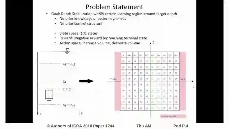 我们对其深度的稳定性的目标是,控制其可变储水容量以维持一个期望的深度。通过强化学习方法来解决这个控制问题,而不需要有系统先验知识或者是有驱动器动力知识。这种方法的挑战在于未知的流体效应,以及缓慢的非线性变化的驱动器动力。体积调整的时间常数与系统的动力匹配,可变容量储水仓相对于固定容量储水仓也是很小的,所以系统的最大控制力和最大约束力也是很小的。