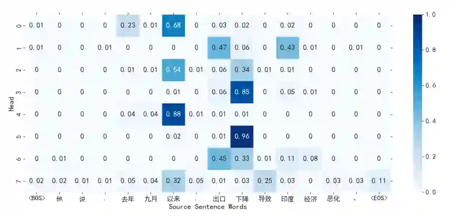 解码器(Decoder)的最后一层对于编码器(Encoder)的多头注意力机制,代表了多重词对齐,即解码器最后一层注意力对应的源端的词,是接下来极有可能会生成的词