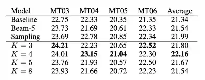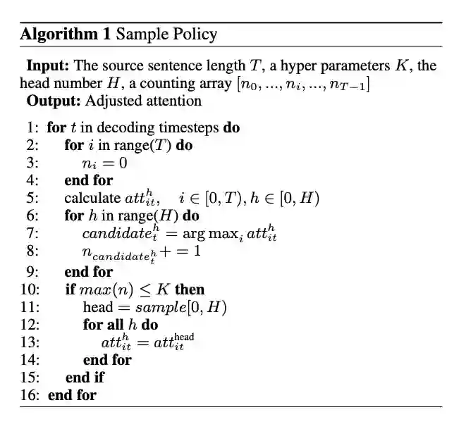 。但如果在生成的每个步骤都进行采样,虽然能显著增加多样性,却也会降低翻译质量。因此,我们提出了一个针对性算法:若多个头都对应到不同的源端词,意味着此时有多个合理的候选,此时我们就进行采样。