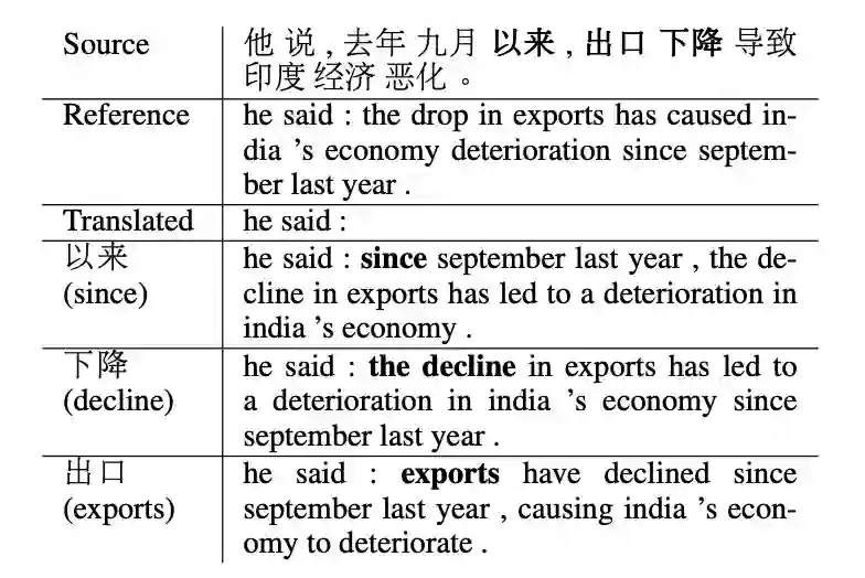 具体见下面的例子,源端句子是“他说, 去年九月以来, 出口下降导致印度经济恶化。