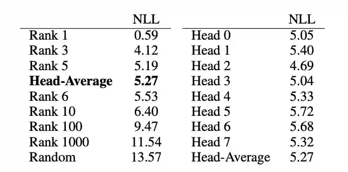 表1:所有情况中排名第R的词的NLL,每个头的NLL都非常小