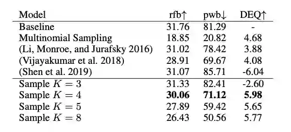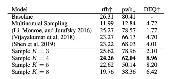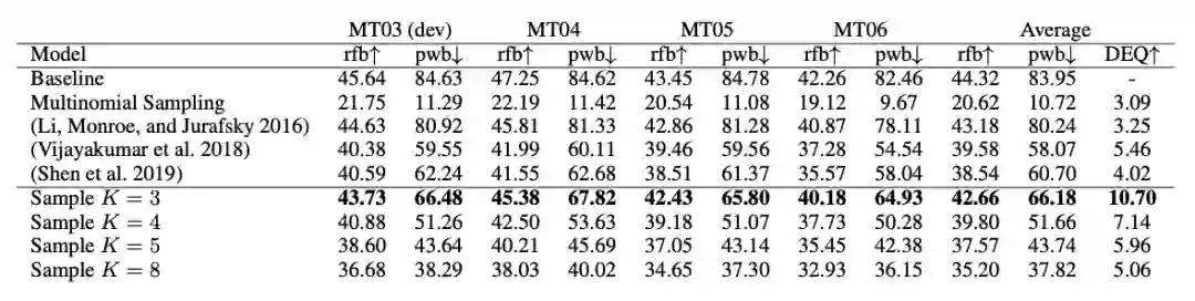 我们在NIST 中英数据集,WMT14 英德数据集,和WMT16 英罗数据集上进行了实验。评价指标主要针对两个方面,翻译质量和翻译多样性,翻译质量仍然采用传统的BLEU,即与参考译文的比较(Reference-BLEU,rfb),越高质量越好,翻译多样性采用多次生成结果之间的BLEU(Pair-Wise BLEU,pwb),越低多样性越好。