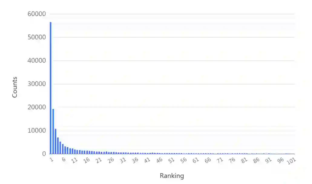1、我们将解码器每个头对应最大注意力值的源端词选取出来,利用翻译的基线模型翻译生成目标端单词,看这些生成的目标端语言单词,在下一步目标端生成的softmax概率表中排名第几,如图1所示,非常尖锐的分布,大部分对应的词都在排名前列。