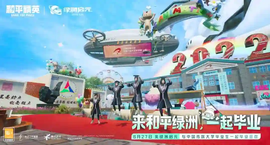 一个似乎能承载世界观、价值观、游戏玩法、生活体验种种方面的虚拟世界大门,由此展开,甚至已经步入现实。在此前上线的绿洲启元“中传群岛”玩法中,《和平精英》绿洲启元研发团队联合中国传媒大学动画与数字艺术学院共同打造了一个属于“毕业生”的美好世界,乘坐和平精英号飞机跳伞空降、签到,在毕业典礼舞台拾取学士服物资换装,在不同学院场景里合影……虚拟与现实的边界在沉浸式的体验中变得模糊,也让“绿洲”变得更像“绿洲”。