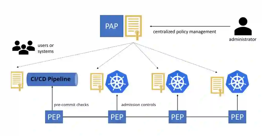 在这种架构中,PAP 创建可供 PDP 使用的策略或策略集。任何一个用户或系统请求都会被 PEP 拦截,PEP 与 PDP 发生交互并决定如何处理请求。PEP 有助于执行策略,确保 Kubernetes 工作负载和集群的当前状态与策略定义的预期状态是匹配的。然后 PDP 会告诉 PEP 应该如何继续。换句话说,就是允许或拒绝请求。