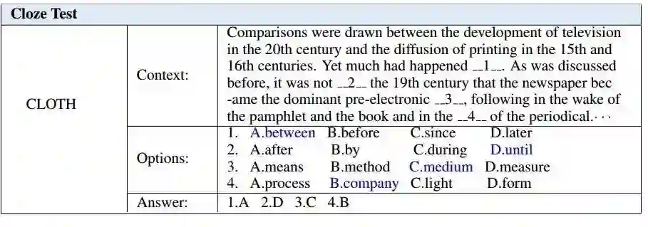 完形填空任务在英语考试中非常常见。如 CLOTH [8] 中的例子所示,原文中的某个词被隐去,我们需要找到正确的词进行填空,使原文变得完整(虽然 CLOTH 数据集中提供了备选答案,但是这在完形填空任务中并不是必需的)。