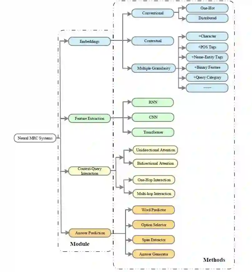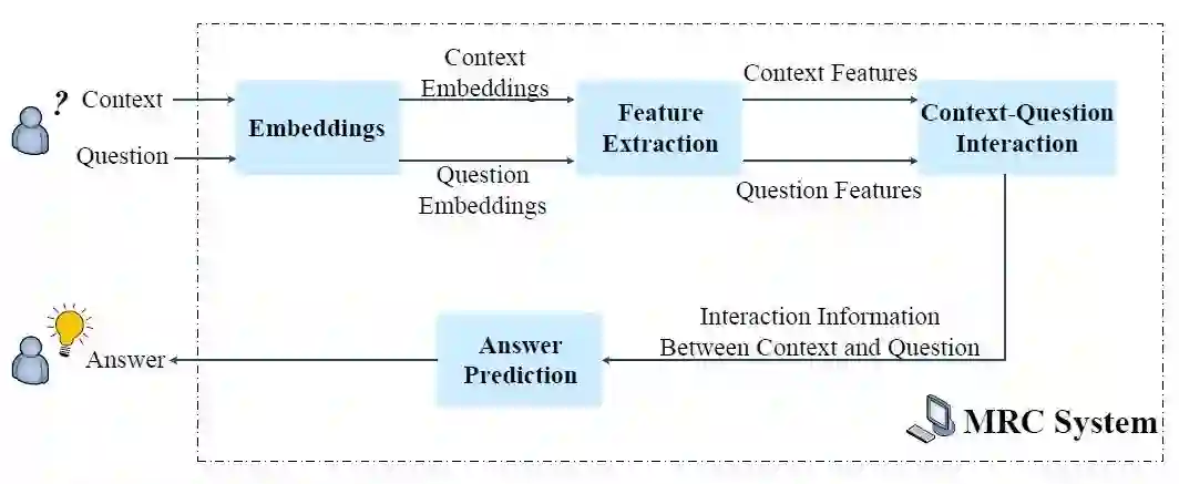 典型的机器阅读理解系统一般包括嵌入编码、特征抽取、文章-问题交互和答案预测四个模块。