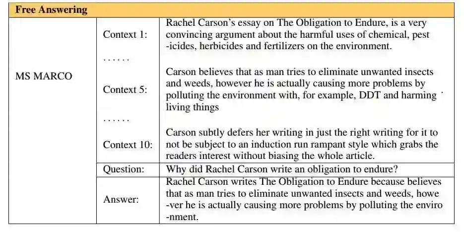 自由作答任务的答案形式最为灵活。如 MS MARCO [3] 中,提供了 10 篇相关的文章,回答问题时需要对文章中的线索进行归纳总结,与片段抽取任务相比,自由作答任务的答案不再限制于原文中的句子,更符合人们平时的作答习惯。