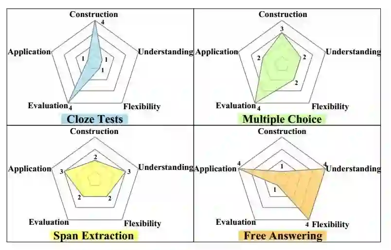我们从构建难易程度(Construction)、对自然语言理解的测试水平(Understanding)、答案灵活程度(Flexibility)、评价难易程度(Evaluation)和实际应用贴合程度(Application)等五个维度出发,对上述四类常见的机器阅读理解任务进行比较,依据每个任务在不同维度上的表现,得分最低 1 分、最高 4 分,结果如下图所示: