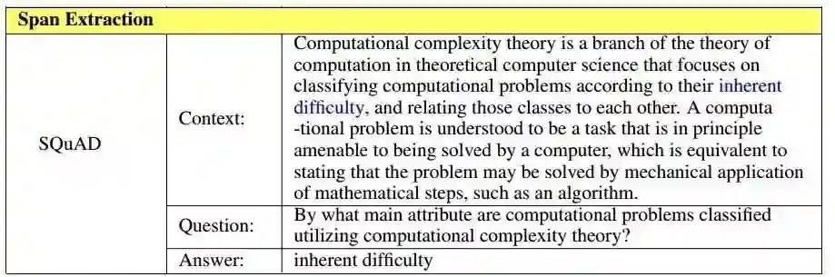 片段抽取任务要求从原文中抽取一个连续的句子(或词组)作为问题的答案。如 SQuAD [2] 中的例子所示,原文中的 inherentdifficulty 被抽取出来作为问题的答案。