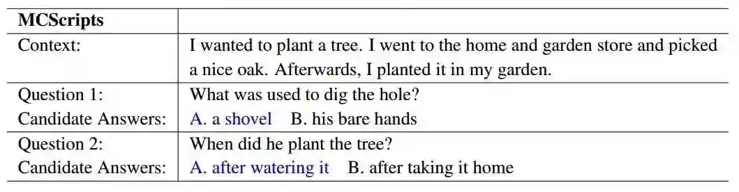 [25] Ostermann S, Modi A, Roth M, et al. Mcscript: A novel dataset for assessingmachine comprehension using script knowledge[J]. arXiv preprintarXiv:1803.05223, 2018.