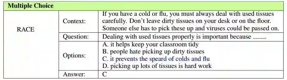 多项选择也是英语考试中的常见题型。如 RACE [11] 中的例子所示,根据文章内容提出一个相关问题,同时给出若干个候选答案,我们需要从候选答案中选择出能正确回答问题的答案。