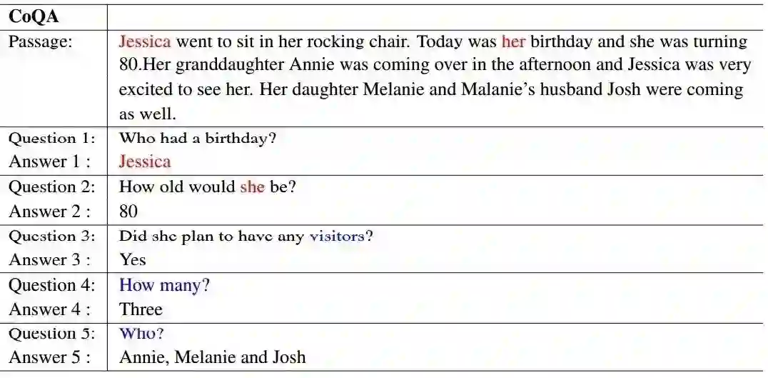 [28] Reddy S, Chen D, Manning C D. Coqa: A conversational question answeringchallenge[J]. Transactions of the Association for Computational Linguistics,2019, 7: 249-266.