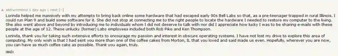 Lorinda Cherry的职业生涯影响了许多人的未来。她帮助过许多人,例如一位在Hacker News悼念并感谢她的人。