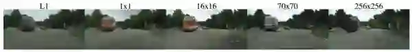 具体实现的时候,作者使用的是一个NxN输入的全卷积小网络,最后一层每个像素过sigmoid输出为真的概率,然后用BCEloss计算得到最终loss。这样做的好处是因为输入的维度大大降低,所以参数量少,运算速度也比直接输入一张快,并且可以计算任意大小的图。作者对比了不同大小patch的结果,对于256x256的输入,patch大小在70x70的时候,从视觉上看结果就和直接把整张图片作为判别器输入没什么区别了: