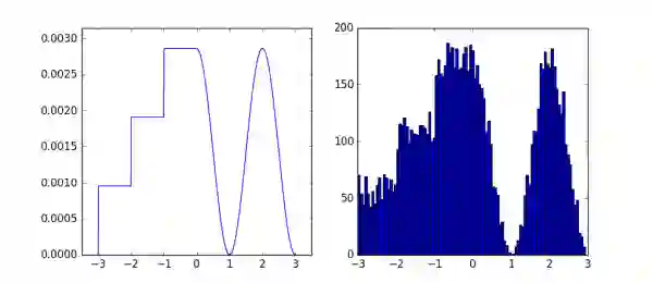 图中左边是一个自定义的概率密度函数,右边是相应的1w个样本的直方图,自定义分布和生成这些样本的代码如下: