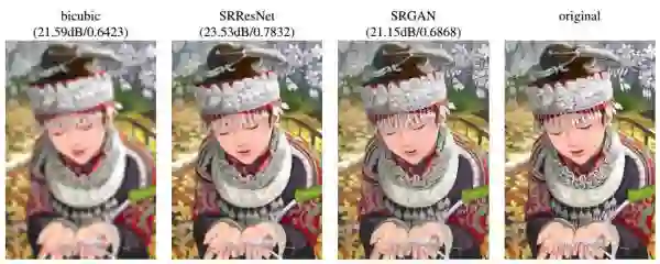 可以看到虽然很多细节都和原始图片不一样,不过看上去很和谐,并且细节的丰富程度远胜于SRResNet。这些栩栩如生的细节,可以看作是GAN根据学习到的分布信息“联想”出来的。