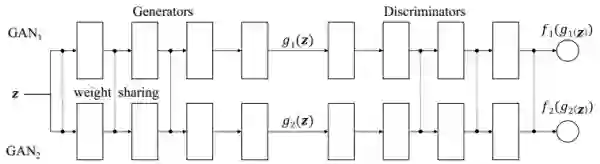 另外上节中提到了Co-Training,感觉这里也应该提一下CoGAN[14],因为名字有些相似,并且也可以用于未配对的图像翻译。CoGAN的大体思想是:如果两个Domain之间可以互相映射,那么一定有一些特征是共有的。比如男人和女人,虽然普遍可以从长相区分,但不变的是都有两个眼睛一个鼻子一张嘴等等。所以可以在生成的时候,把生成共有特征和各自特征的部分分开,示意图如下: