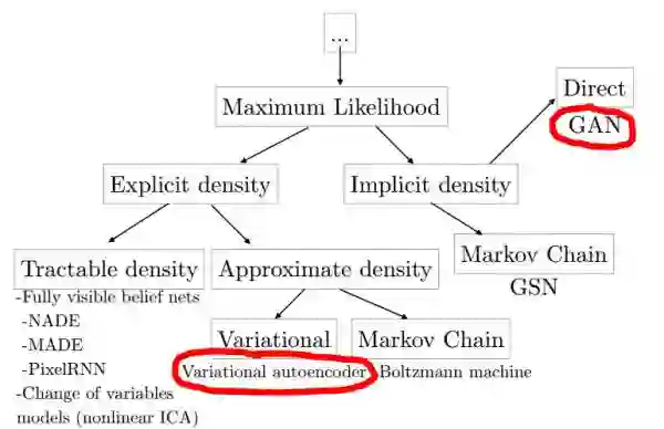 所以虽然GAN里面同时包含了生成网络和判别网络,但本质来说GAN的目的还是生成模型。从生成式模型的角度,Ian Goodfellow总结过一个和神经网络相关生成式方法的“家谱”[1]: