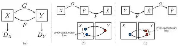 映射回来显然不可能是多个不同的x,所以加入cycle-consistency就帮助避免了mode collapse。这个问题在另一篇和CycleGAN其实本质上没什么不同的方法DiscoGAN中有更详细的讨论[12],有兴趣的话可以参考。