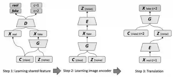 第一步用噪声Z作为和domain无关的共享表征对应的latent noise,domain信息作为条件C训练一个C-GAN。第二步,训练一个encoder,利用和常见的encode-decode结构相反的decode(generate)-encode结构。学习好的encoder可以结合domain信息,把输入图像中和domain无关的共享特征提取出来。第三步,把前两步训练好的encoder和decoder(generator)连一起,就可以根据domain进行图像翻译了。