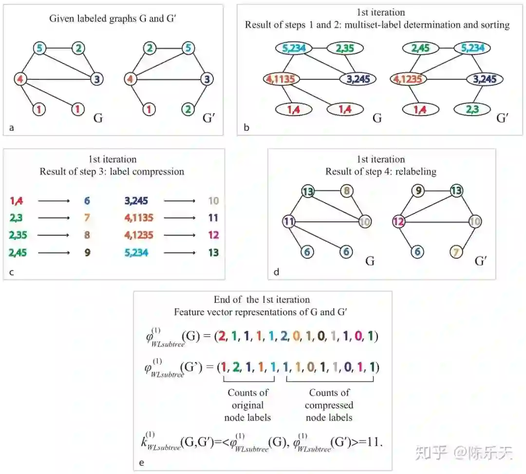 WL test是判断两个Graph结构是否相同的有效方法,主要通过迭代以下步骤来判断Graph的同构性: (初始化:将节点的id作为自身的标签。)