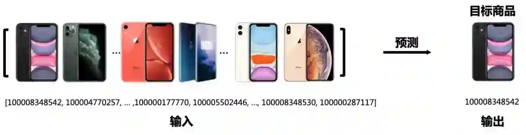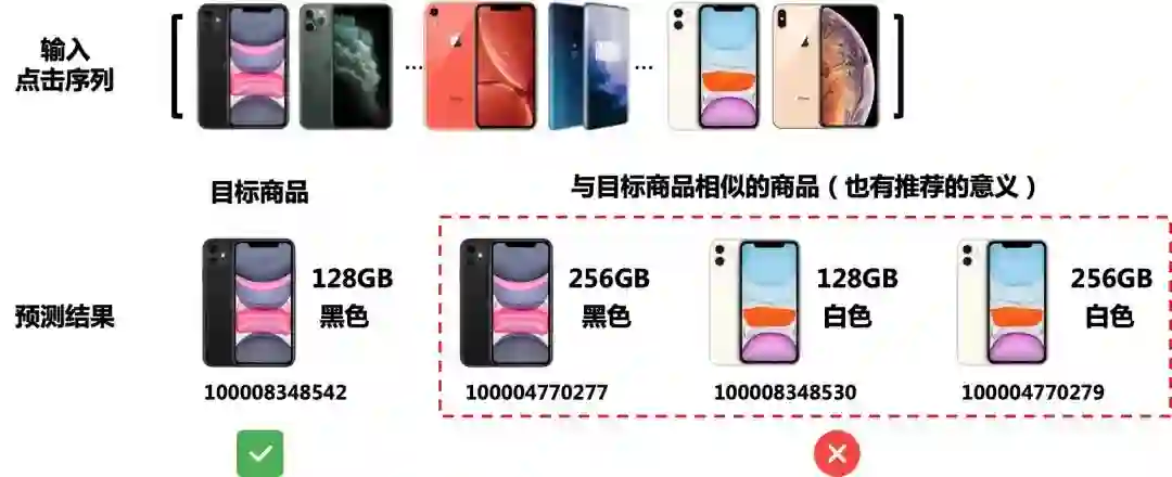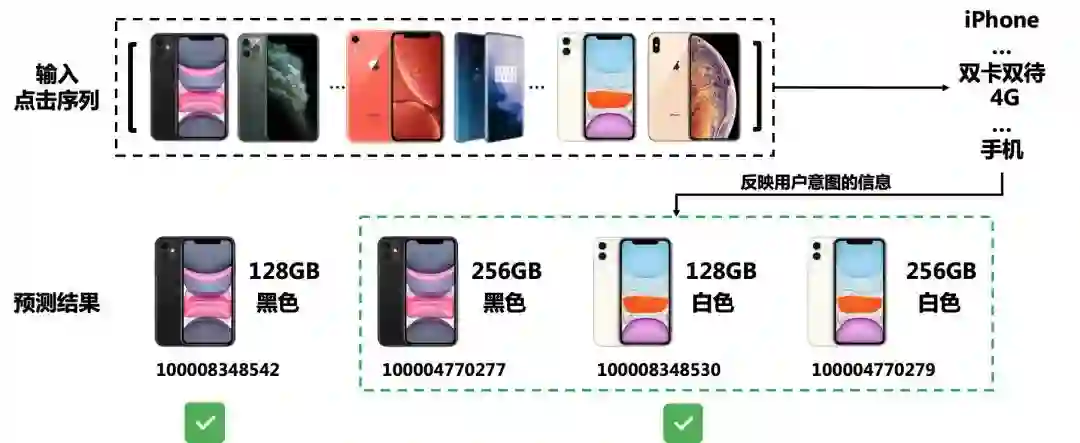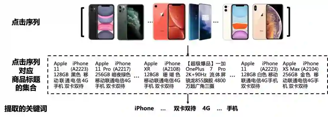 然后,我们设计了一个新的任务,即关键词生成。该任务利用输入的点击序列生成关键词。因此,当我们用多任务学习将基于会话的推荐和关键词生成结合之后,包容性低的问题得到了缓解。以图6为例,不同颜色、不同配置的手机,一定程度上能反映出相似的信息(例如,“iPhone,双卡双待,4G,手机”)。因此,对于推荐系统来说,即使推荐绿框内的三款手机会受到来自目标商品监督的惩罚,但在多任务学习的情况下(当关键词生成任务权重较大时),这三款手机仍可能被推荐系统纳入考虑,推荐的效果会得到提升。其次,因为关键词是按照词频提取的,直接忽略了意外点击的商品的信息。因此,通过引入关键词,也能缓解不可靠点击产生的影响。