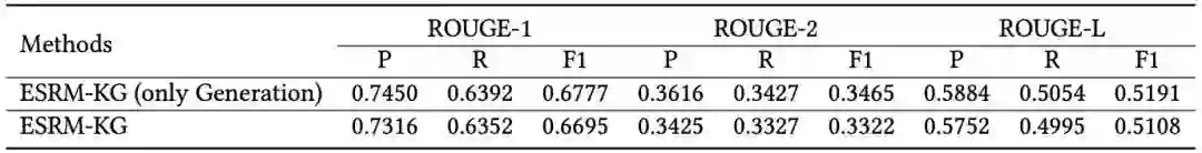 ESRM-KG(only Generation)表示ESRM-KG模型删除了点击预测部分。如表7所示,我们发现ESRM-KG(only Generation)模型在所有指标方面都优于ESRM-KG模型。基于这种现象,我们认为基于会话的推荐可能对关键词的生成没有帮助。对于推荐任务,即使预测商品与目标商品非常相似,也仍将被视为负例,受到惩罚。因此,关键词生成可能经常会因基于会话的推荐而遭受“干扰”,性能会下降。