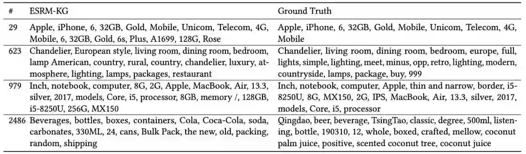 我们展示了模型输入和输出的样例。为了方便观察,我们用商品图片替换商品ID。在输入点击序列中,我们注意到大多数商品与一类商品(即主机)相关。因此,我们将主机当作当前会话的意图。从表4中,我们可以观察到:由于缺少其他信息,意外点击(即输入点击序列中的第10个点击,显示器)会对推荐产生严重的影响。具体而言,在ESRM-KG (only Prediction)模型提供的推荐列表的前20名中,有6种商品与显示器相关。在关键词生成的帮助下,ESRM-KG模型从点击序列中学习到额外的信息。因此,大多数推荐结果与主机有关。此外,通过比较两个模型的推荐列表中目标商品的排名,我们发现ESRM-KG模型推荐效果更好。最后,从ESRM-KG模型生成的关键词中,我们可以观察到ESRM-KG模型在捕获当前会话的意图方面表现良好。