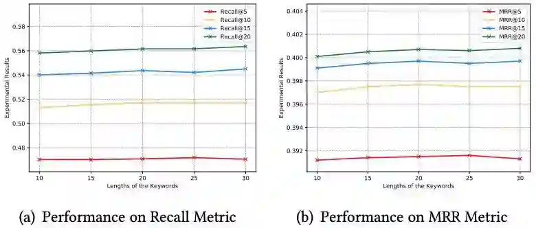 TOP-K表示ESRM-KG(L=top-k)模型。这里的K范围是10、15、20、25和30。如图14所示,就Recall和MRR而言,我们发现TOP-20优于TOP-10和TOP-30。但是,在Recall和MRR上,TOP-10和TOP-15的结果不太好。从这种现象,我们发现,当关键词的长度太小时,它可能会提供不足的信息,这将使关键词生成对推荐的帮助受到很大限制。此外,我们可以看到TOP-30在Recall@15,Recall@20,MRR@15和MRR@20上取得了最佳结果。但是,在Recall@5和MRR@5上,TOP-30不如TOP-25,在Recall@10和MRR@20上不如TOP-20。关于这种现象,我们认为可能导致较长的关键词可能使得ESRM-KG模型倾向于生成关键词。尽管推荐性能在某些方面得到了增强,例如Recall@20,但它也面临目标商品在推荐列表中排名较低的问题。