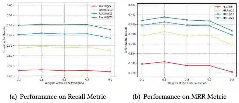 我们采用了Recall@K和MRR@K来评价点击预测。在实验中,K=5, 10, 15, and 20。