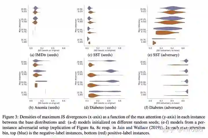 1,Jain和Wallace(2019)的论文《Attention is not Explanation》将注意力权重的分布和基于特征的显著性度量分布进行比较,并且做了将句子输入进行扰动然后对注意力权重做对抗性搜索,得出结论: