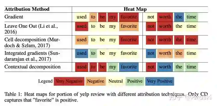 题外话:值得注意的是,这篇文章的比较中提到积分梯度方法比CD(Contextual Decomposition,这又是另一个方法了)和LRP要差?我特地去找了他的论据如下: