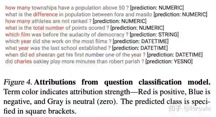 问题分类,标记红色和蓝色分别对应支持预测结果的token和不支持的token。