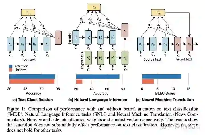 Vashishth等人(2019年)《ATTENTION INTERPRETABILITY ACROSS NLP TASKS》提出注意力机制在单个序列的模型中远不如涉及两个序列的模型(如NLI或MT)重要。