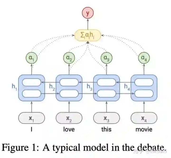 首先,介绍一下在如下关于注意力方法是否构成可解释的争论中,讨论的基本模型:Bi-LSTM+tanh Attention文本分类模型(如下图):