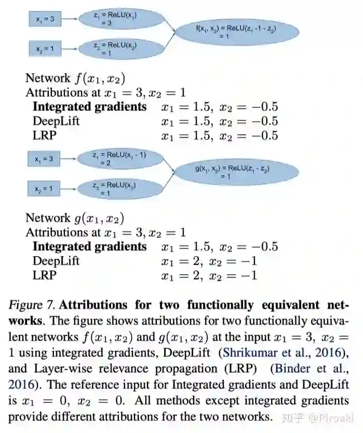 Implementation Invariance(实现不变性):如果两个结构实现不同的网络的输出对于所有输入均相等,则它们在功能上是等效的,则应当满足其归因一致。归因方法应满足实现不变性,即,对于两个功能等效的网络,归因始终是相同的。这样的定义不涉及实现细节。
