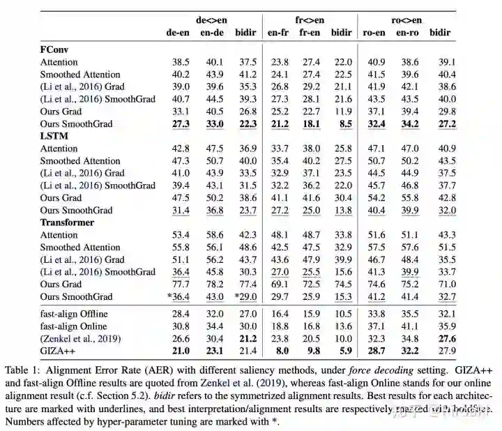下图为对比的实验结果,这里的比较方法为将注意力的关注结果与人工标注的结果进行对比,指标为AER(Alignment Error Rate):