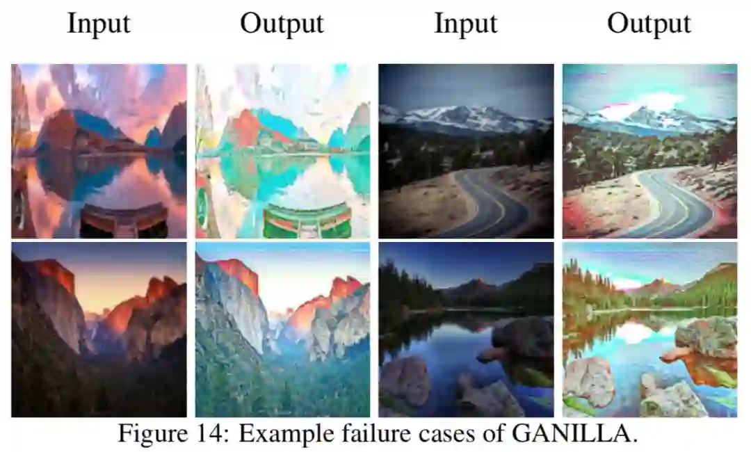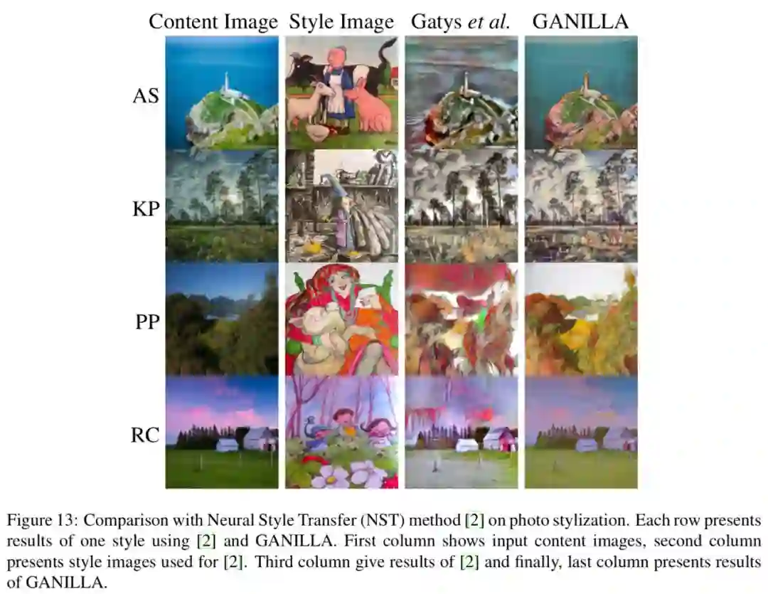 作者还将 GANILLA 与 Gatys 等人的神经风格迁移 (Neural Style Transfer, NST) 进行了对比,对于 NST 模型,分别使用一张内容图和一张风格图,如下图结果所示,NST 方法无法就插图数据的风格化得到成功的结果,因为其只使用一张内容图和风格图,最终结果高度依赖输入输入图像。