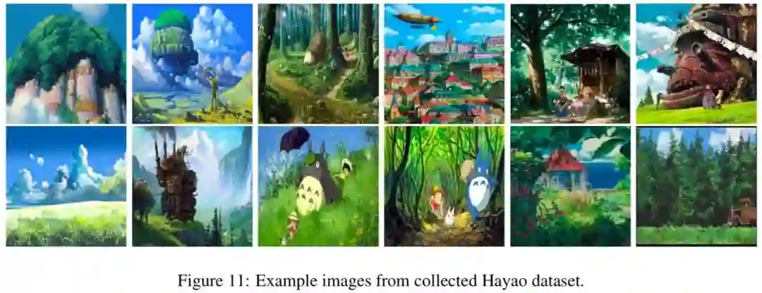 作者还收集了部分宫崎骏的插图作为训练集进行了实验,下图分别展示了收集的数据集和基于宫崎骏风格的迁移结果。