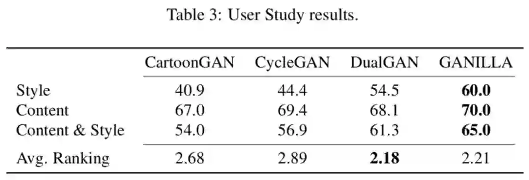 在风格和内容方面,GANILLA 似乎是最好的方法。在视觉效果评价排名上,DualGAN 略微超过了 GANILLA,主要原因是 DualGAN 未能成功迁移风格,用户认为这些图像更具有视觉吸引力是因为其结果看起来更自然。
