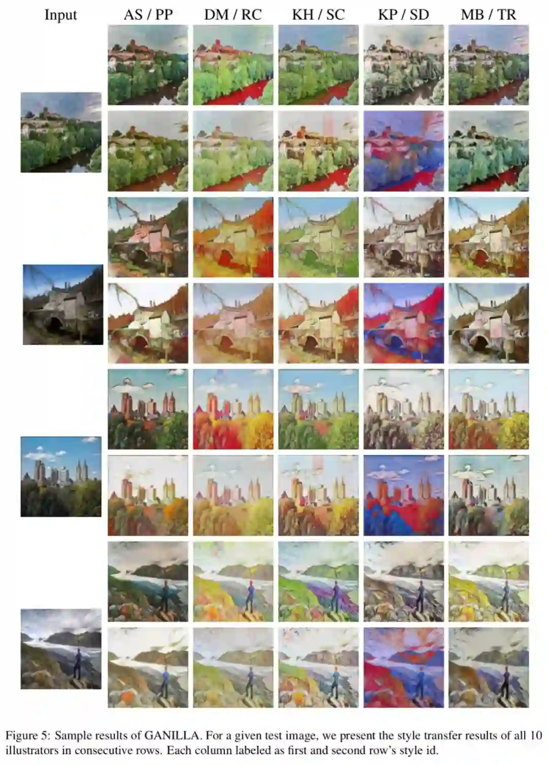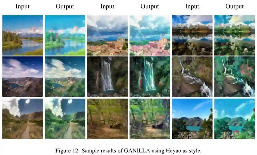 下面图5展示了输入相同的图片,基于不同插图艺术家的风格 GANILLA 生成的结果,虽然对某些艺术家来说生成的图像包含不太明显的缺陷,但大部分图像都能成功捕获目标风格。