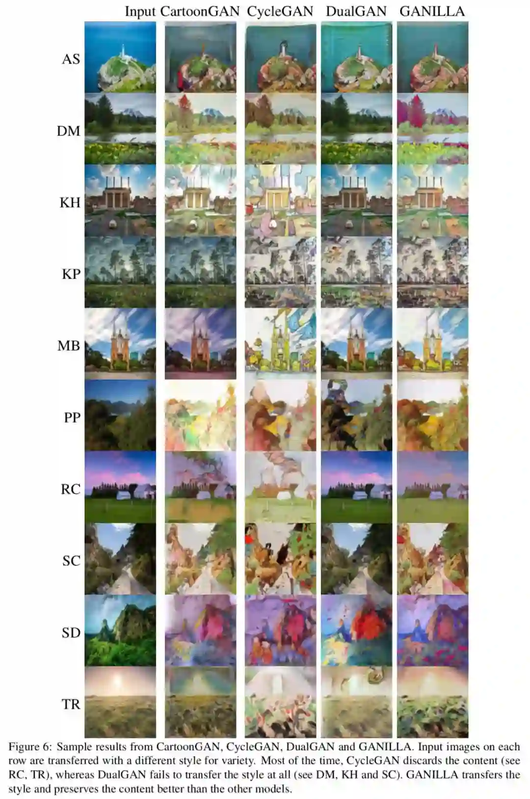 下面图6针对每个插图艺术家,输入相同图片,CartoonGAN、CycleGAN、DualGAN 和本文的 GANILLA 分别生成的结果,只有本文方法能够在保留输入图片内容的前提下成功地迁移了风格。