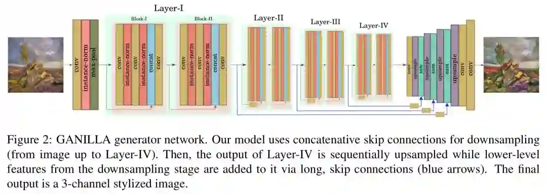 在对图像到插图问题的初步实验中,作者观察到当前未配对的图像到图像的翻译模型 (unpaired image-to-image translation models) 如 CycleGAN[3], DualGAN[4], CartoonGAN[5] 等都无法同时迁移风格和内容。为此作者设计了一种新的生成器网络,能够在保留输入图片内容的同时迁移风格。