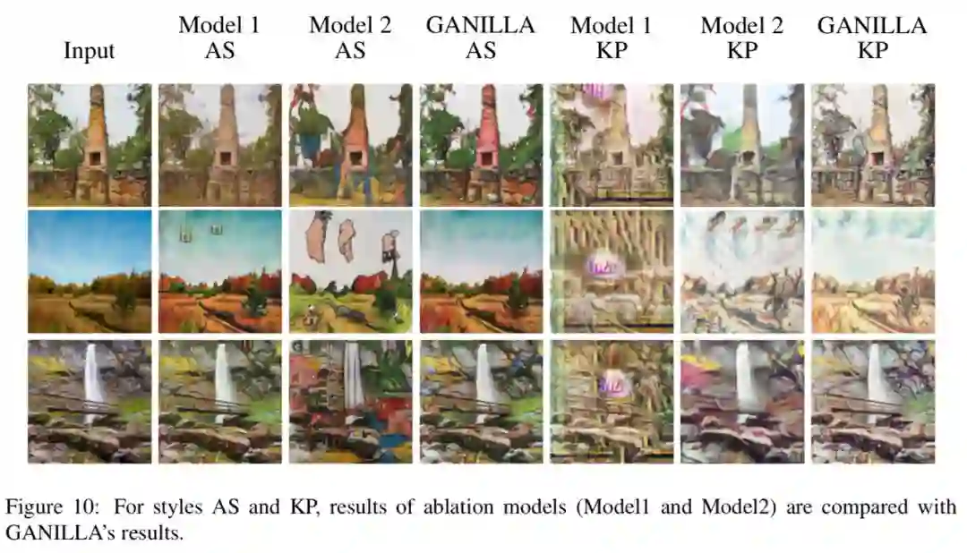 作者还进行了两组对比实验。第一组对比模型将 GANILLA 中的下采样卷积层替换为原始的 ResNet-18,第二组对比模型将 GANILLA 中的上采样卷积层替换为 CycleGAN 和 CartoonGAN 使用的反卷积层。作者定量比较了实验结构,对比模型Model 1内容分与 GANILLA 相近,但是风格得分较低,这表明作者对 ResNet-18 网络的修改有助于输入图像的风格化。对比模型Model 2能够得到更高的风格分,但其内容分较低,这说明在上采样阶段使用低层特征有助于保留输入图像的内容。