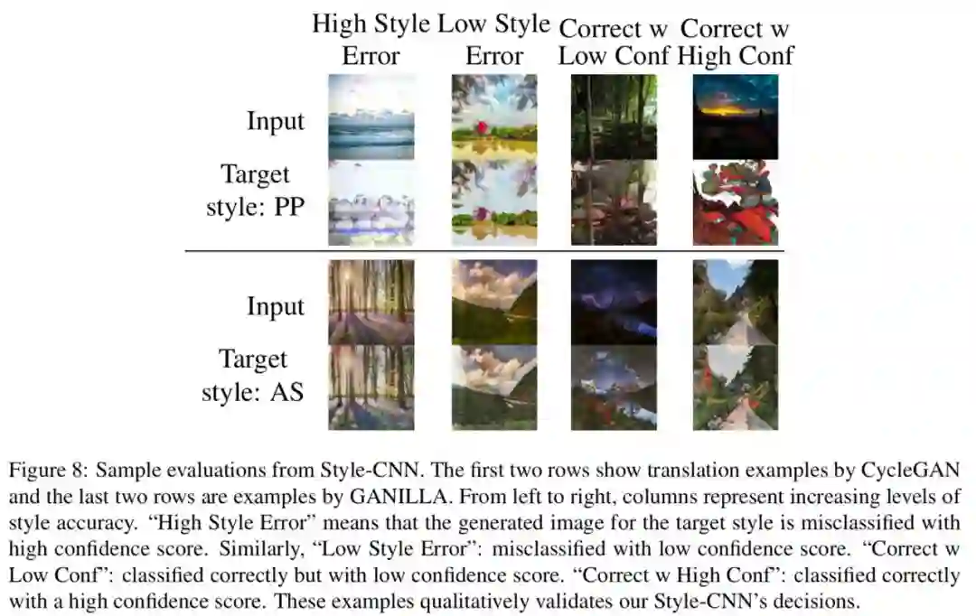 为了定量评价风格迁移的质量,作者提出了风格分类器 Style-CNN,从图像中随机裁取 100x100 大小的像素块,将其送入分类器中进行训练。训练集包含11个类别,包含10个插图艺术家和1个自然图像,如果生成的图像缺乏风格,其更有可能被分类为自然图像。下面图8展示了 Style-CNN 的结果。