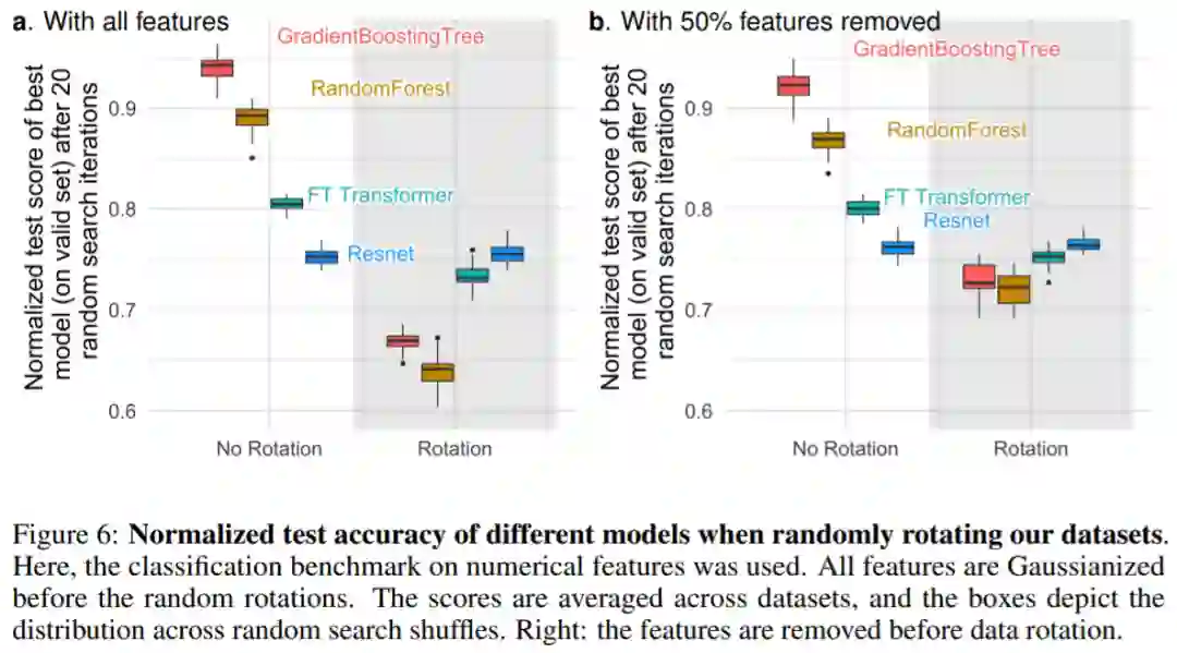 图 6a 显示了当对数据集进行随机旋转时的测试准确率变化,证实只有 Resnets 是旋转不变的。值得注意的是,随机旋转颠倒了性能顺序:结果是 NN 在基于树的模型之上,Resnets 在 FT Transformer 之上,这表明旋转不变性是不可取的。事实上,表格数据通常具有单独含义,例如年龄、体重等。
