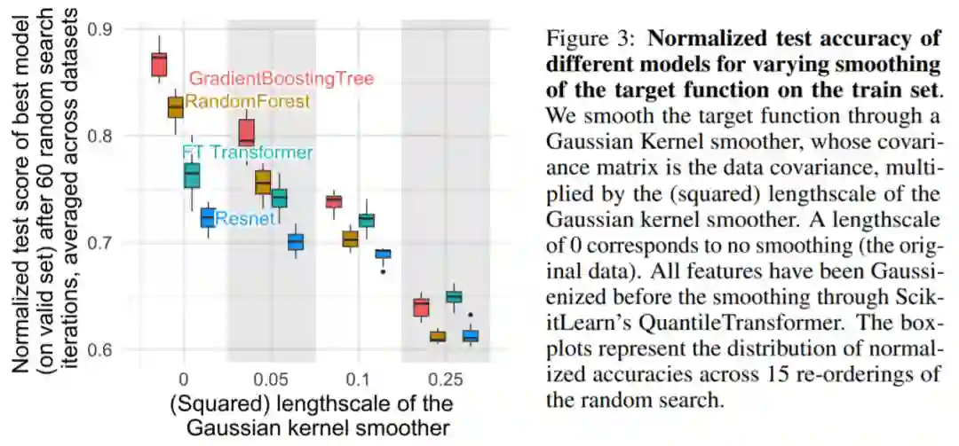 如图 3 所示,对于较小的尺度,平滑训练集上的目标函数会显着降低基于树的模型的准确率,但几乎不会影响 NN。这些结果表明,数据集中的目标函数并不平滑,与基于树的模型相比,NN 难以适应这些不规则函数。这与 Rahaman 等人的发现一致,他们发现 NN 偏向于低频函数。基于决策树的模型学习分段(piece-wise)常函数,没有这样的偏置。