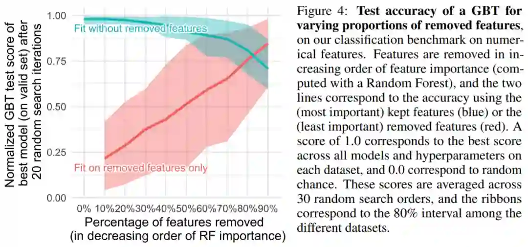 表格数据集包含许多非信息( uninformative)特征,对于每个数据集,该研究根据特征的重要性会选择丢弃一定比例的特征(通常按随机森林排序)。从图 4 可以看出,去除一半以上的特征对 GBT 的分类准确率影响不大。