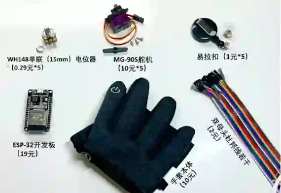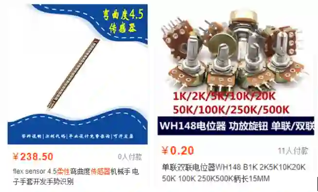 旋转式电位器(其原理类似于初中课本上的滑动变阻器)与拉绳连接使用,当手指弯曲时,五条拉绳分别带动五个电位器,拉绳拉出的长度被转化为电位器阻值的变化,传递给虚拟世界做解析。